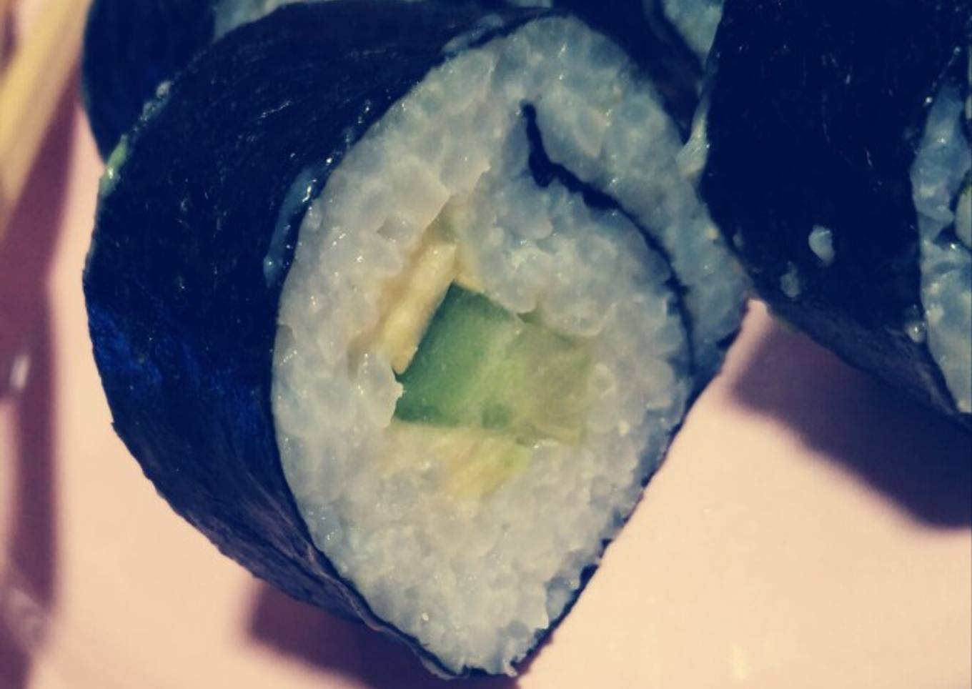 - Sacamos un alga nori, para manejar el arroz lo mejor es tener las manos mojadas. Colocamos en arroz y dejamos un dedo del alga sin poner arroz y por el otro extremo el que tiene el arroz le ponemos el pepino y el aguacate y empezamos a enrollar.