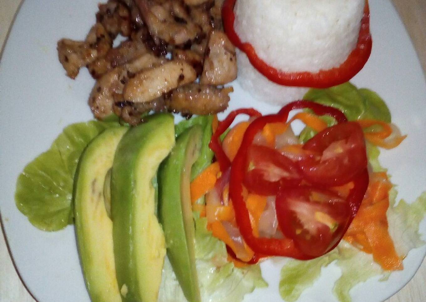 - Terminado nuestro pollo ya dorado servimos con la ensalada y arroz blanco, y ahora a comer Rico