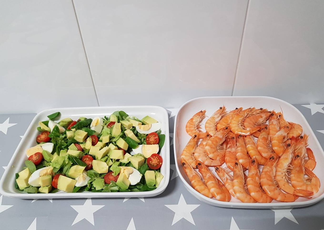 Cena 1: langostinos y ensalada canónigos, aguacate, cherry, huev