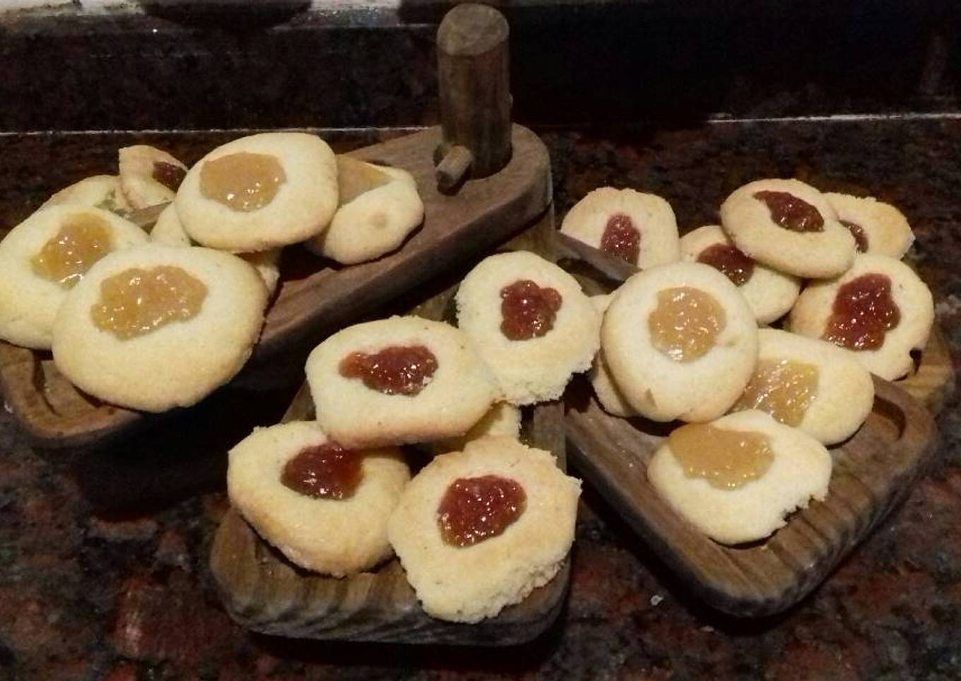 - Acomodalas en la plaquita que tengas para el horno que tiene que estar enmatecada y enharinada. Una vez en la placa con el dedo les haces un guequito en el centro para poder ponerles el dulce.