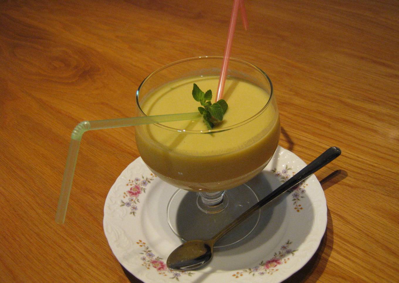 - Metemos la batidora y batimos todo junto, cuando está todo bien batido lo pasamos a unos vasos o copas y servimos adornamos con unas hojitas de menta y dejamos enfriar. Servir muy frío.