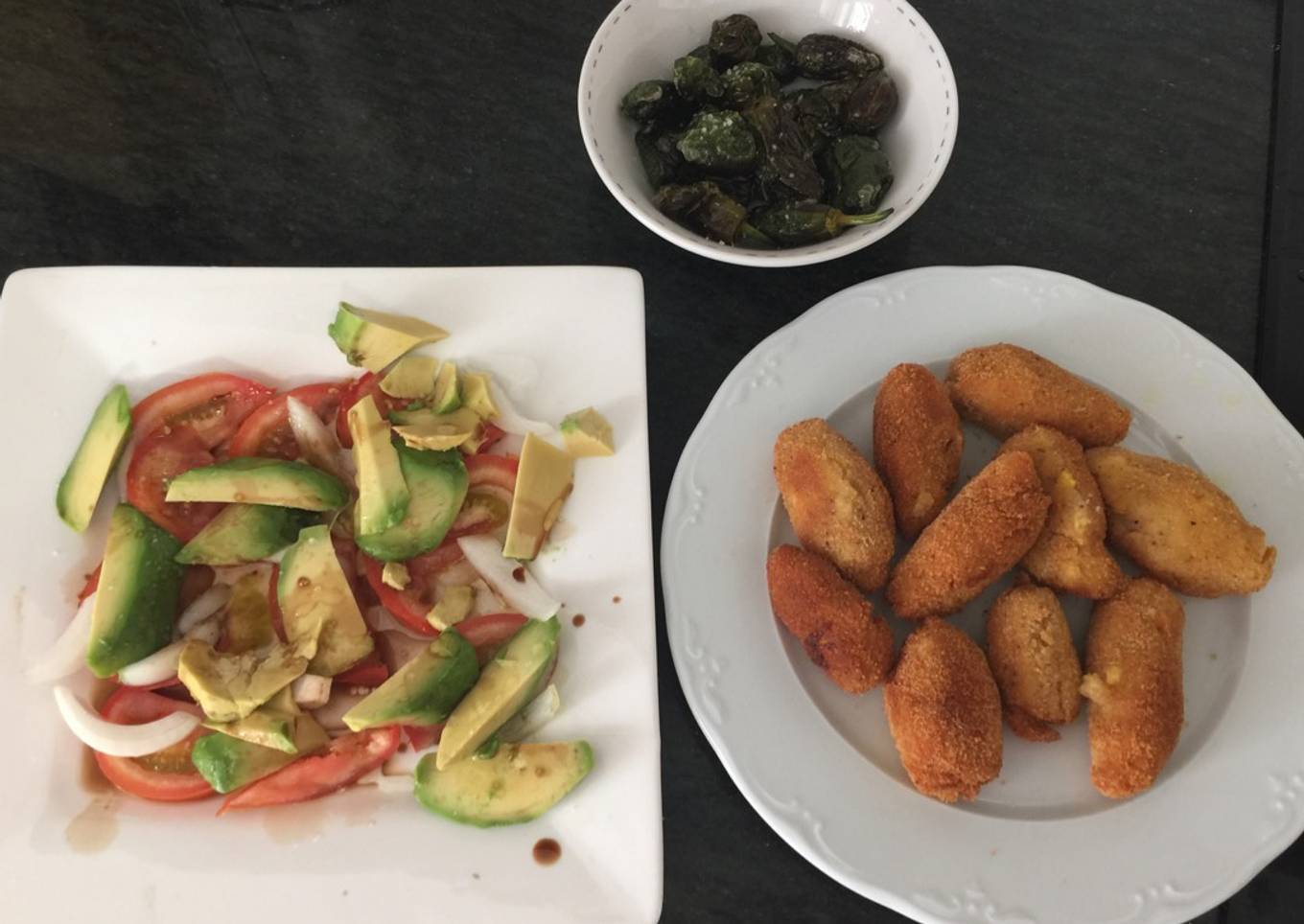 Croquetas de carne con ensalada de tomate y aguacate 馃 馃崊 y pimientos de Padr贸n