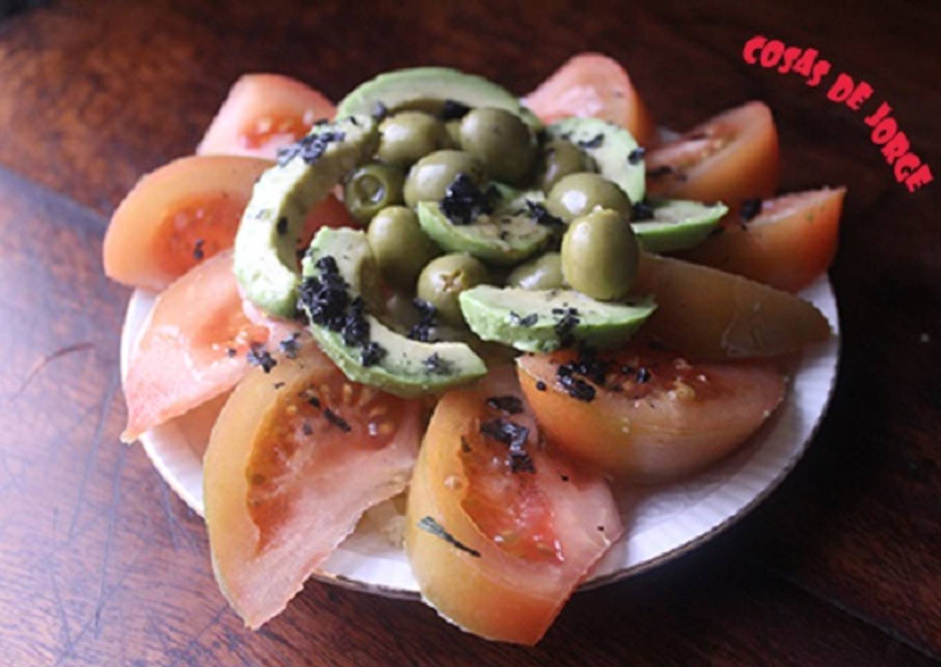 Ensalada de aguacate y tomate con sal negra