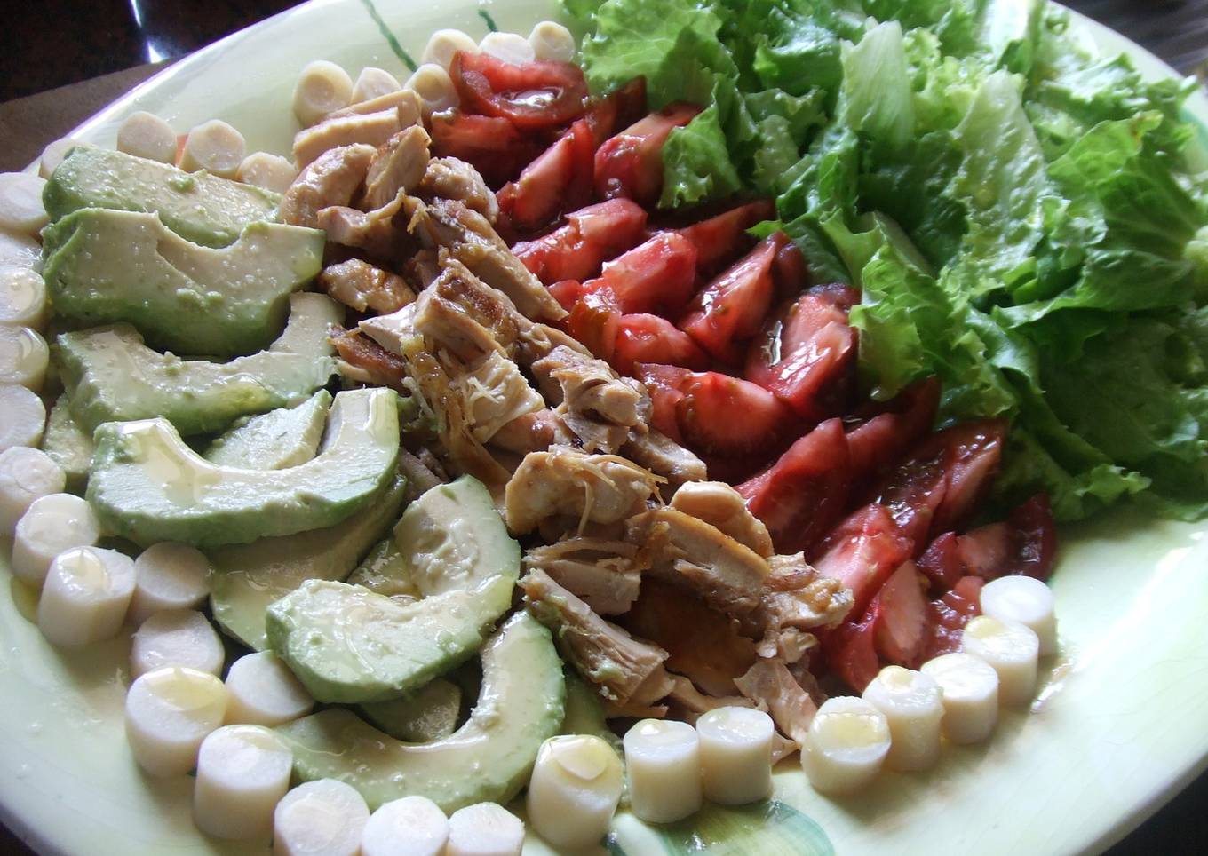 - Colocar a un lado de la fuente de servicio las lechugas y delante de ellas ir alternando las rodajas de tomate, el pollo, el aguacate y los palmitos.