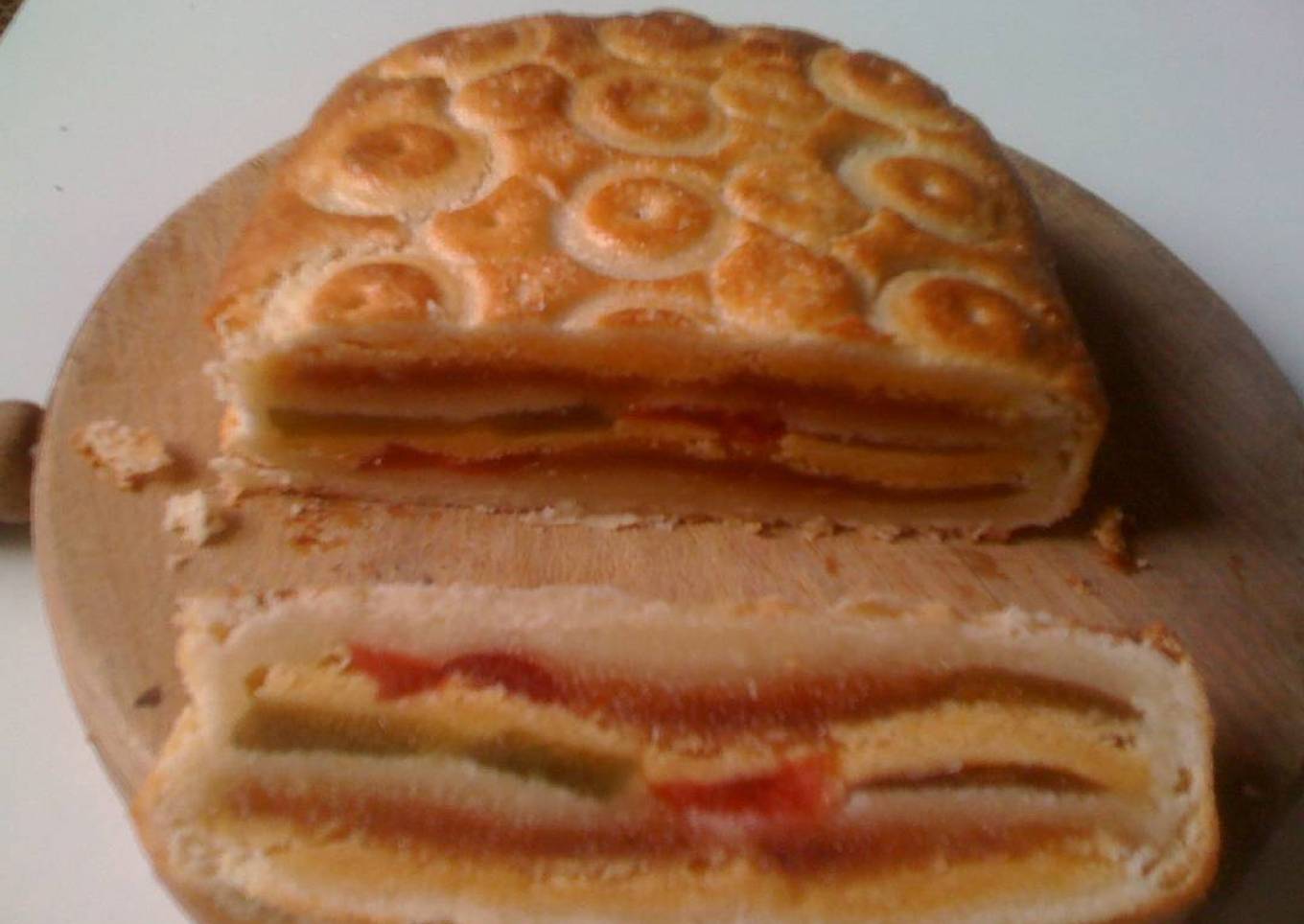 - Sobre el mazapan de yema colocamos una capa de dulce cortado en láminas de 1/2 cm. Del mismo modo que los anteriores estiramos el mazapan blanco destinado al relleno, colocamos encima del dulce, presionando un poco para unirlo, cortamos las frutas confitadas en tiras, las vamos distribuyendo por encima, estiramos el resto del mazapan de yema, humedecemos, ponemos encima de las frutas, apretamos, otra capa de dulce, el mazapan blanco, con la ayuda del film vamos envolviendo y cerrando el paquete.