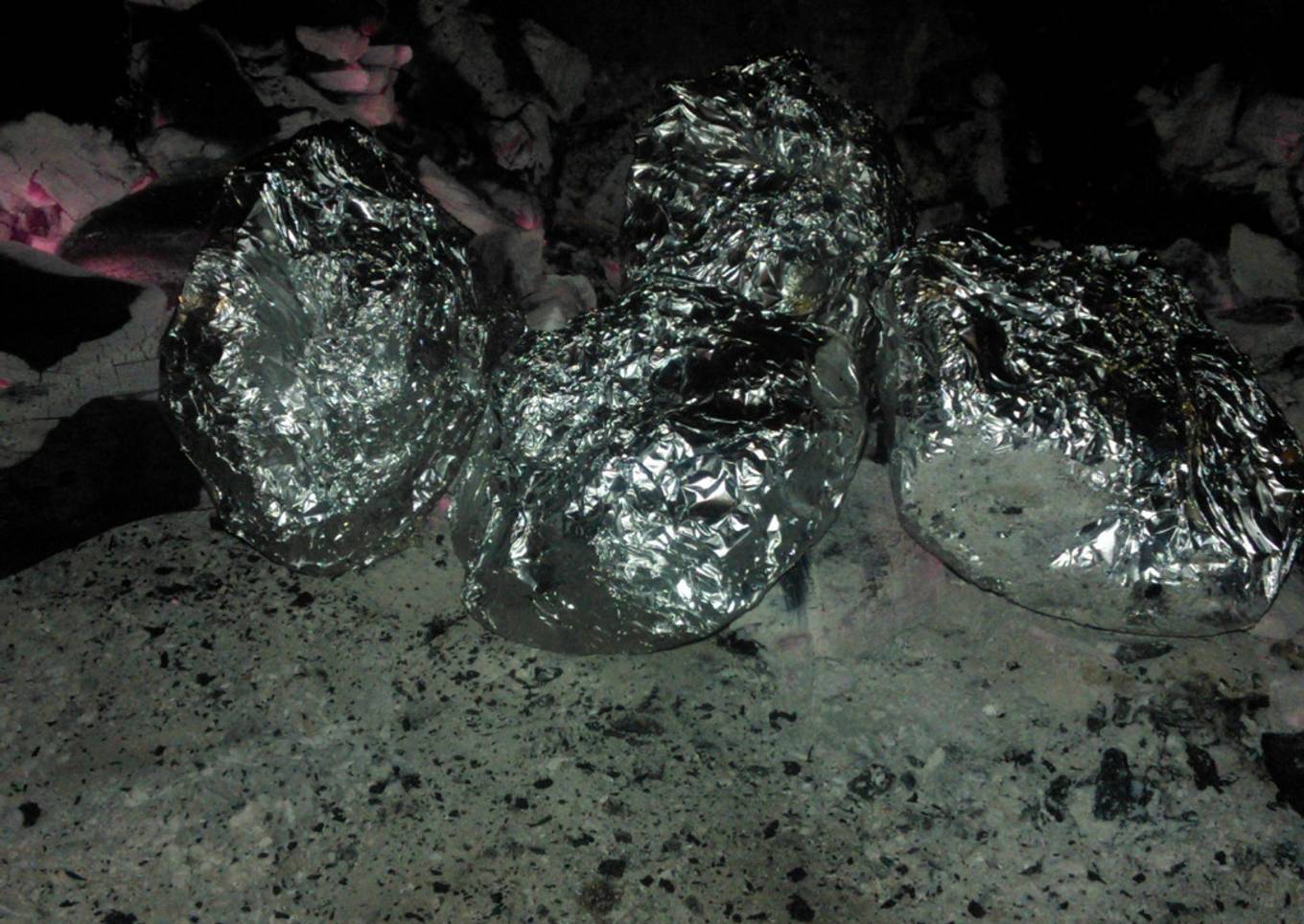 - Se tiran las papas y/o batatas sobre las brasas del fuego sin pelarlas, se las deja hasta que exteriormente tomen color negrusco quemado momento este que usamos para rotarlas, repitiendo la operación hasta que el color exterior sea uniforme.