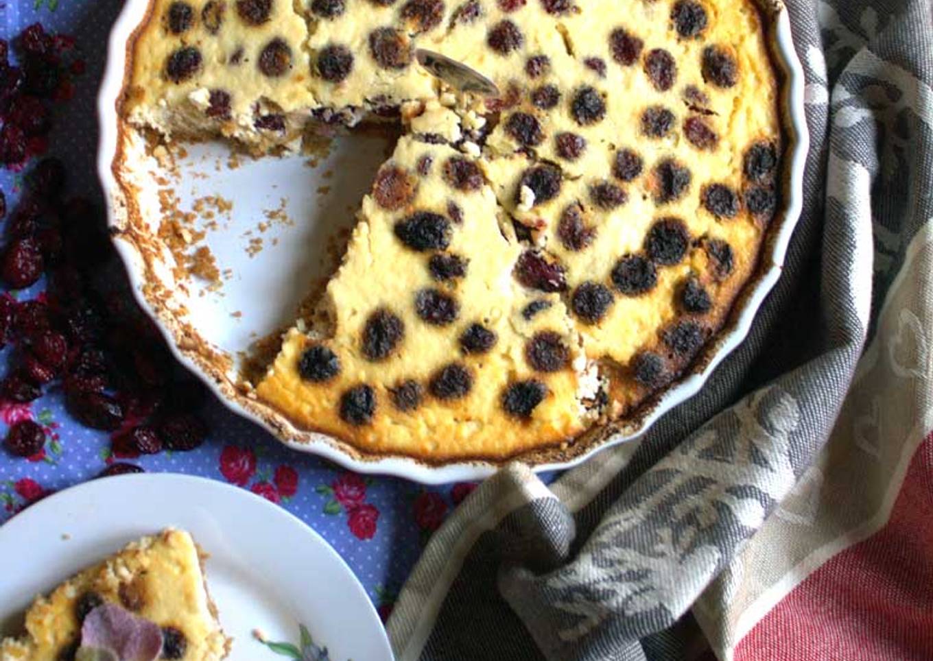 Este pastel lo preparé el año pasado cuando se acercaba la navidad y tiene un sabor estupendo. Perfecto para acompañar cualquier tarde con un café o un chocolate caliente. Su sabor recuerda a las quesadas tradicionales pero la acidez de los arándanos hace que cada mordisco sea diferente