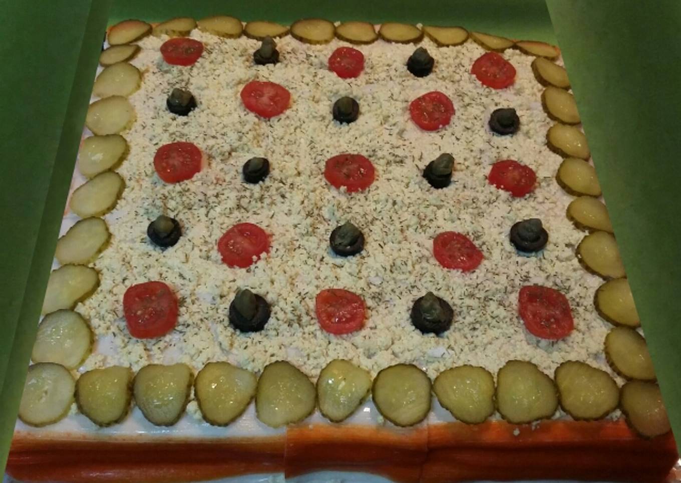 - Cortamos en rodajas los pepinillos grandes agridulce que nos sobraron antes y los colocamos alrededor de todo el pastel. Espolvoreamos un poco de eneldo por encima del huevo desmenuzado.