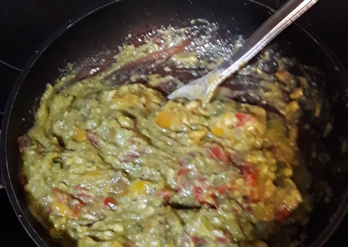 - Lavar y cortar los pimientos de tres colores. Freírlos con poquito aceite y tapando la sartén. Una vez cocinados pelaremos el aguacate y machacarémos la pulpa y mezclaremos con los pimientos.
