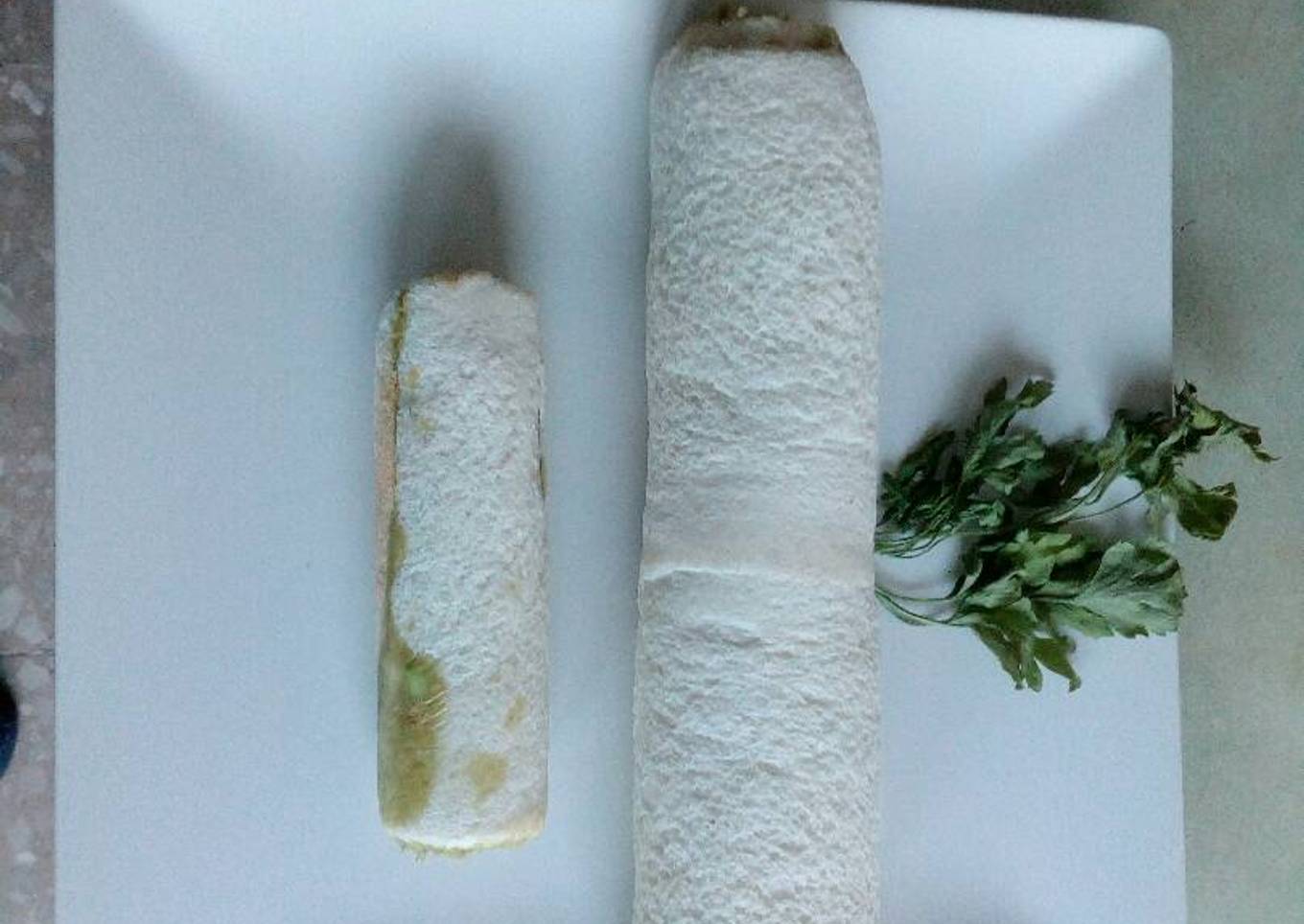 - Ponemos 4 rebanadas de pan de molde sin corteza poniendo una encima de otra y con un rodillo las aplastamos bien para que se junten.