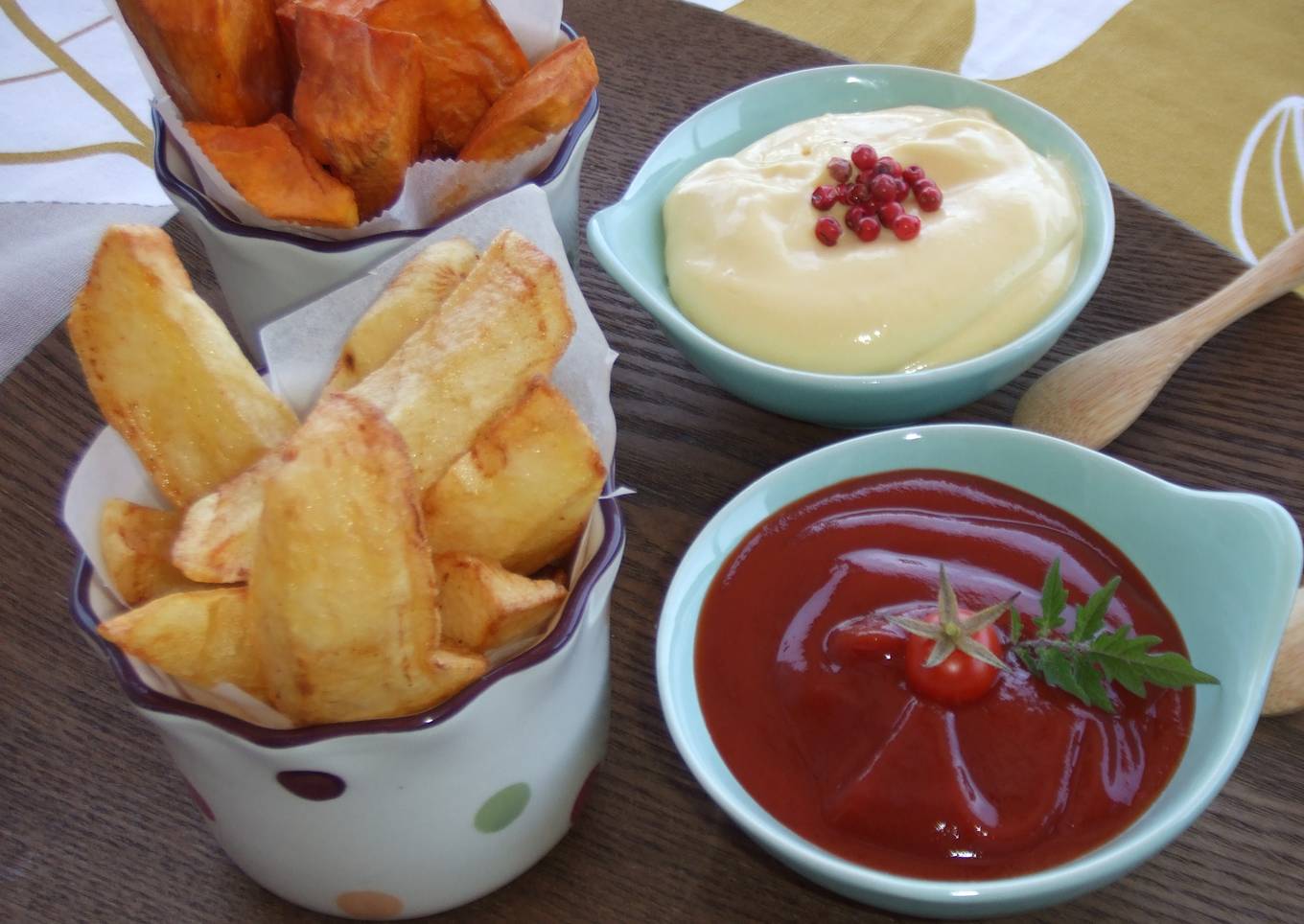Instructions to make to make Bastones de patatas y batatas fritas con salsas