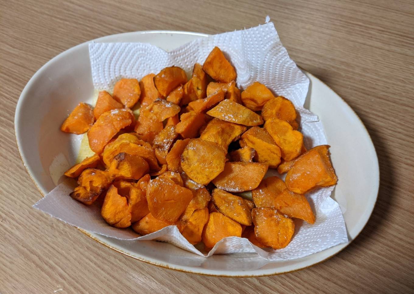 - Lo sacamos con espumadera, escurriendo el aceite lo mejor posible, las echamos en una fuente con un papel de cocina que absorba el exceso de aceite, añadimos un poco de sal por encima y listo, a disfrutar del manjar!