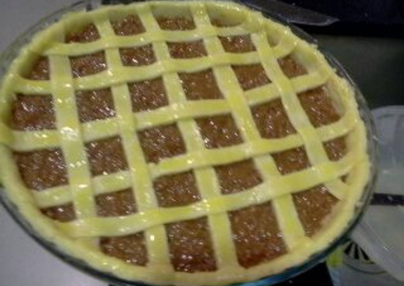 - Estirar y colocar en molde de tartas, recortar el excedente y dejar un poco de masa para las tiritas.
