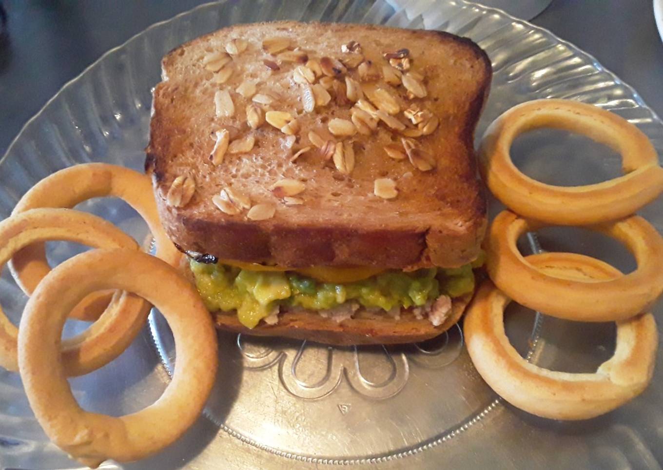 Sándwich de Atún... 🍞🥫🥑🥒🥓🥪con aros de Pan de Arroz🍟🥨.